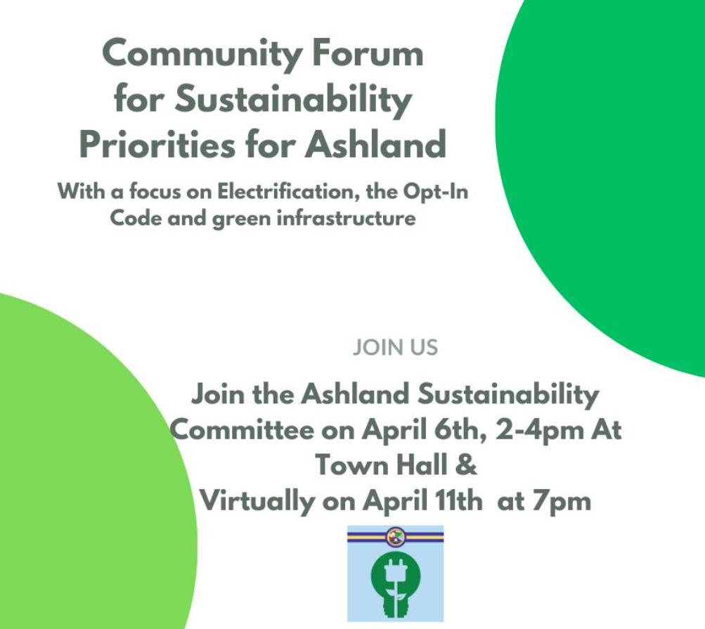 The Ashland Sustainability Committee will be hosting a second public forum on April 11 virtually on Zoom at 7:00 PM. A presentation will be focused on electrification, opt-in building code and green infrastructure. The opt-in building code will be on the Warrant for Town Meeting.